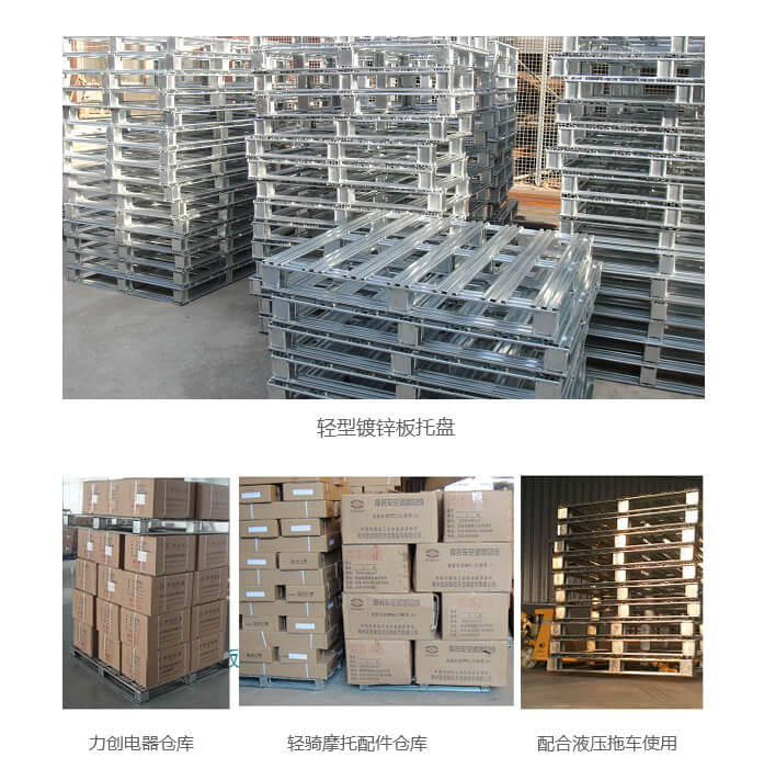 輕型B型鍍鋅托盤 產(chǎn)品用途: 本產(chǎn)品采用上海寶鋼大鋅花0.5—1.0mm厚的鍍鋅板軋壓變形,優(yōu)點(diǎn)質(zhì)量輕承重好,焊點(diǎn)處涂銀粉油漆或植物桐油防止焊點(diǎn)生銹。應(yīng)本產(chǎn)品熱鍍鋅層面工藝,防銹能力非常強(qiáng),廣泛用于輕工業(yè)制造,如冷鏈、食品車間生產(chǎn)、酒水制造,電子制造倉(cāng)儲(chǔ)與周轉(zhuǎn)。對(duì)比木板托盤免熏蒸,常作為隨貨底托,隨產(chǎn)品一次性出口。提示:不建議上貨架,如上貨架,主材厚度1.2mm。